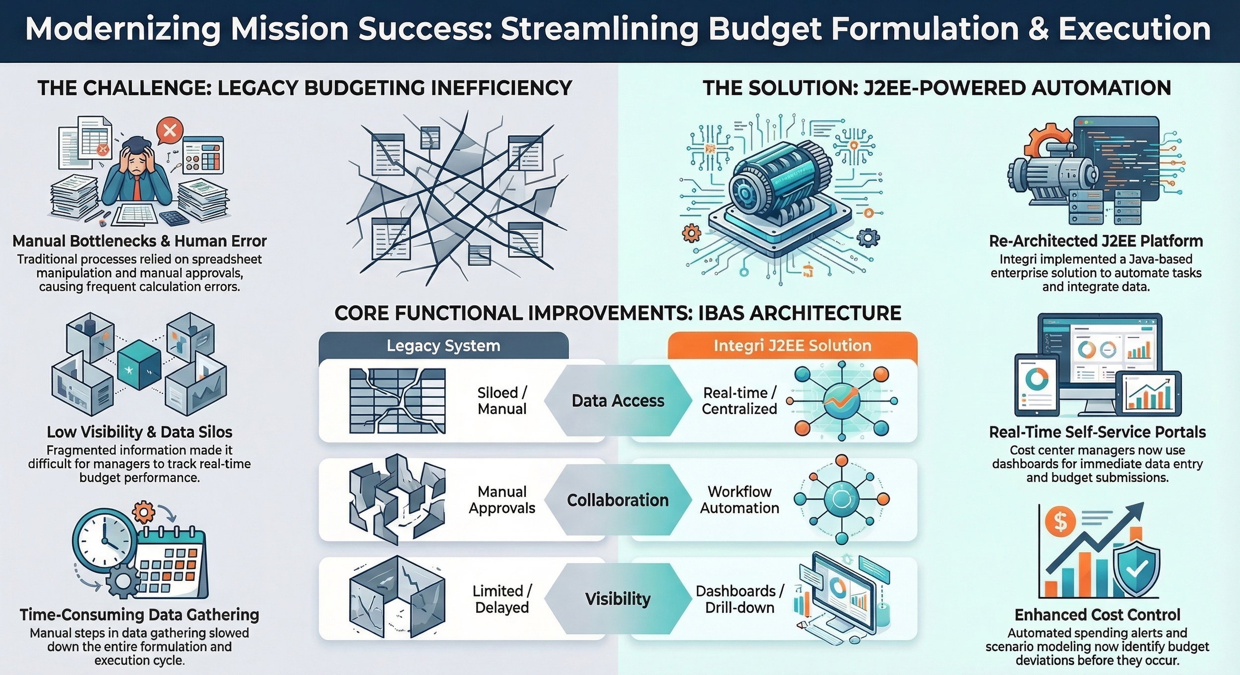 Solution: Re-architected outdated financial systems into the modernized J2EE-based IBAS software application, deploying real-time dashboards and automated self-service portals.