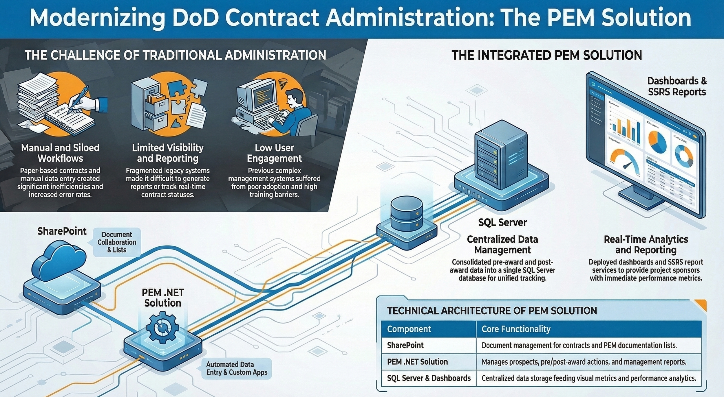 Solution: Developed the Project Execution Management (PEM) application, which utilizes SharePoint as a central repository and integrates custom .NET development to automate data entry.